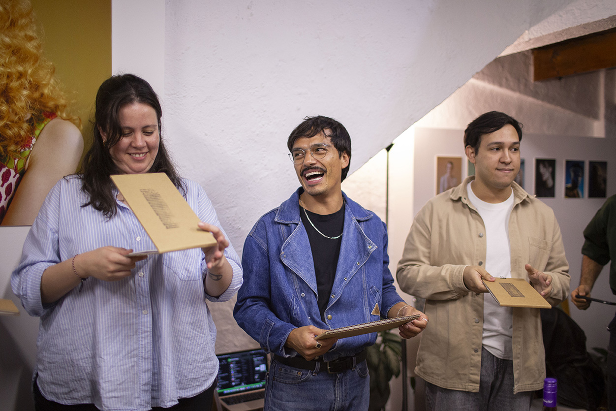 Desde Spotify cada quien agregó su música y entre pláticas y risas llegamos al momento de la rifa de seis gift cards, que obsequiamos entre los invitados que se registraron. Además, entregamos a cada asistente un kit de regalo que incluía un cupón de descuento y una postal diseñada por Mario.